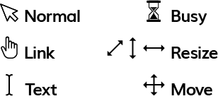 The pointer will turn into a symbol that looks like an uppercase letter "I" when you hover over text and are able to drag and select it.The pointer will appear as an hourglass symbol when it is working to complete a task and is not available to be used at the moment. Lastly, the mouse pointer will display as various arrows when you have the option to resize or move icons and windows.